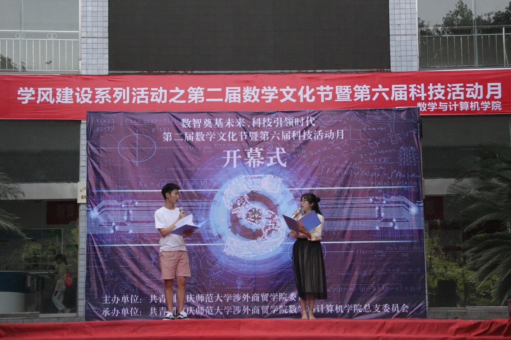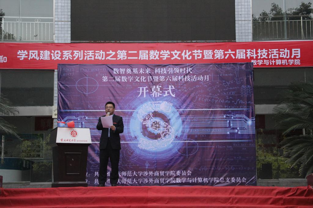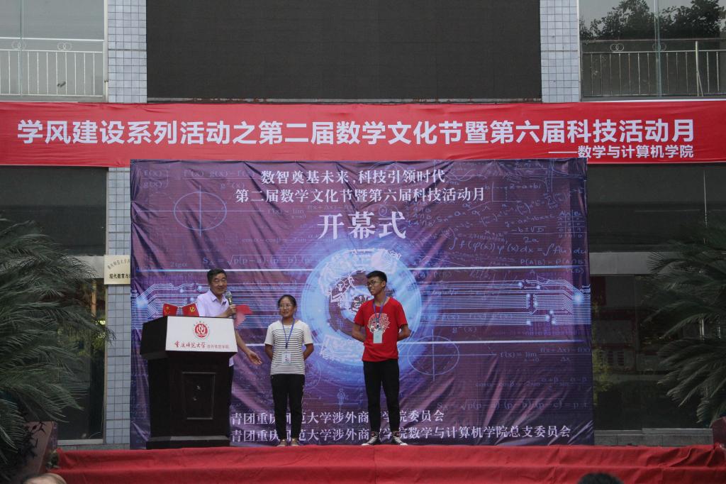 学风建设是高校校风建设的重要内容,为进一步加强学风建设,全面落实2019年全国教育工作会议要求,全国高校科技工作会议精神和学校“三大工程”“六大划”“九项行动”,我院于2019年4月25日在第三教学楼前举行了学风建设系列活动之第二届数学文化节暨第六届科技活动月开幕式。参加此次开幕式的有:我校党委副书记冉久飞、学生处处长伍祥伦、教务处处长陈东升、团委书记任杰、学生处副处长赵鹏、我院院长王良成、党总支书记彭高中、副院长赵洁、合川移动市场部总监陈嘉、校园中心总负责人刘俊、各学院团总支书记、副书记、辅导员、教师代表以及学生代表。