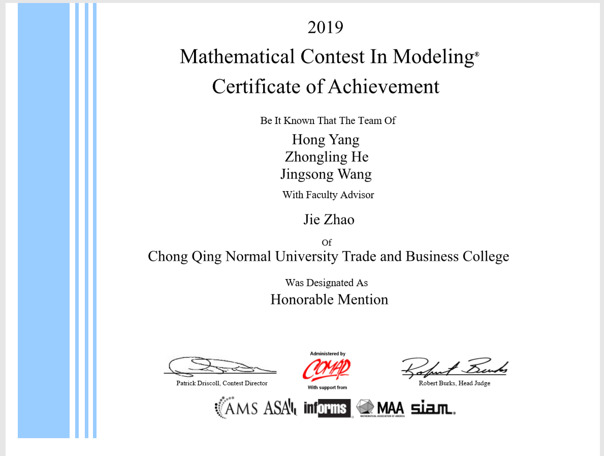 4月19日,根据美国大学生数学建模竞赛官网公布的成绩,由数学与计算机学院首次组织学生参加2019年美国大学生数学建模竞赛(以下称美赛)分别获得H奖和S奖。