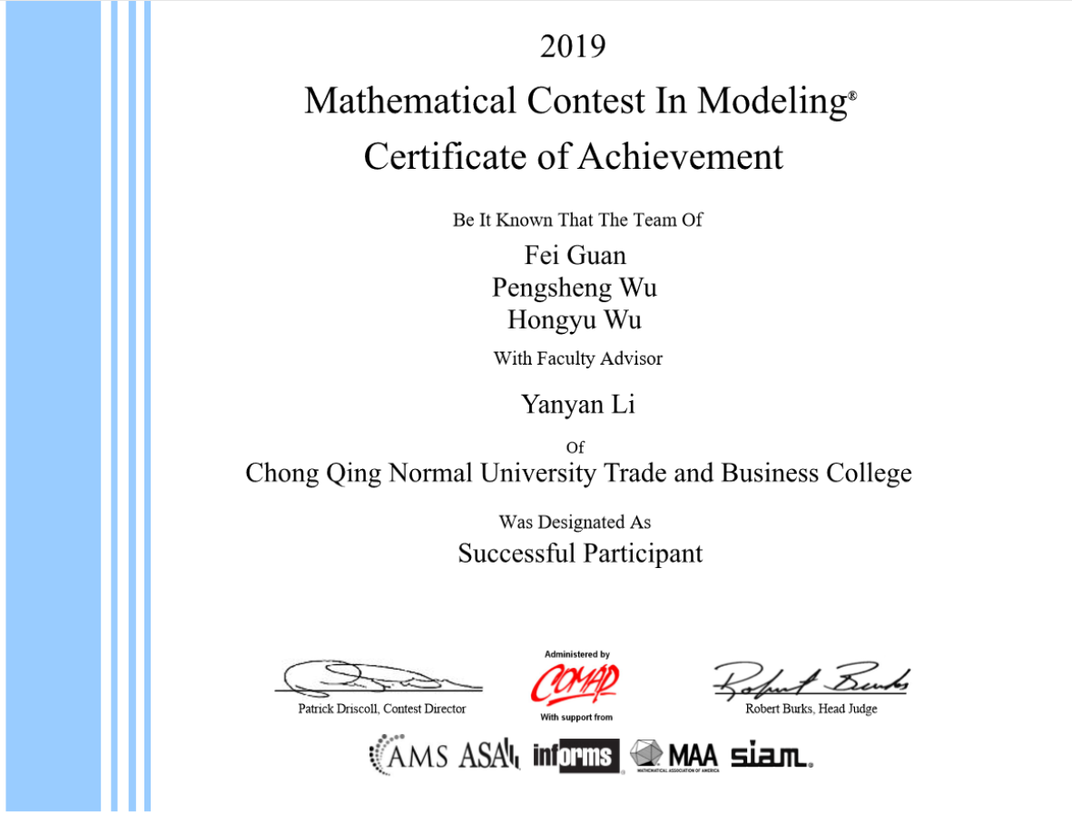 竞赛期间,各支代表队相互交流、团结合作,克服种种困难,按时提交了建模论文。最终一组获得Honorable Mention(二等奖),另一组获得Successful Participant(成功参赛奖)的优秀成绩。值得一提的,这也是重庆市第一所独立学院参赛并获得奖项。