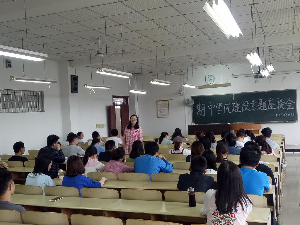 学风兴则班风兴,班风兴则校风兴,校风兴则学校兴。为了积极响应学校学风建设的号召,更好的解决学生学习的困惑,营造良好的学习氛围。数学与计算机学院于2018年5月10日下午14:00在3515教室举办了期中学风建设专题座谈会。本次座谈会由数学与计算机学院冷震北老师、徐燕老师主持,随机抽取数学与计算机学院尾号为5的学生参与本次座谈会。
