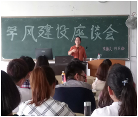 会议开始,何庆龄老师介绍了本次座谈会召开的目的,并对我院的学习情况做出了个人的阐述,紧接着指出了同学们的学习态度、学习方法、自信心在学习中的重要性。并针对这些方面提出了一些解决方案:①学习需自己去挖掘并逐步形成数学思维,要懂得潜移默化的练就学习本能;②要学会树立自信心,学会自我调节,注意掌握有效的自我学习方法,在学习中懂得举一反三;③要心有目标,以制定个人日程表,并严格要求自己;④对同学采取放养教育,与同学们而言弊大于利,一定的约束条件有利于同学们的学习和成长;⑤学委要做好榜样带头作用,且要随时关注班级同学动态,并以身作则,在班级做好表率,以加强班级学风建设。⑥同学们要养成预习的好喜欢,以便温故而知新,并学会定下心来在课堂上认真听课、积极思考,自觉且自愿远离手机。⑦学会抓住机会提升自己的语言组织能力(教师、教态);⑧加强写作,注重周围的人际交往关系。最后何庆龄老师对此次座谈会做出了一个小小的总结:学委不仅仅只是学委这一角色,同时也充当着纪律委员、心理委员的角色,所以班级学风建设中,学委是标榜、是模范、也是好的班风引领者,针对本班的情况,学委们应作出好的改进措施,带动同学们一起为本班同学创建一个良好的班风学风,以求共同进步。