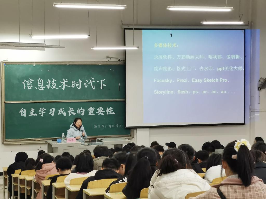 为帮助学生了解信息技术时代的特点,明确信息技术对教学模式产生的变革,提高大学生的自主学习能力,我院于2020年12月17日下午在铜梁校区2308教室开展以“信息技术时代自主学习成长的重要性”为主题的院长沙龙。本次讲座由数学与计算机学院教学副院长赵洁副教授主讲,学院2020级学生和部分教师代表参加讲座。