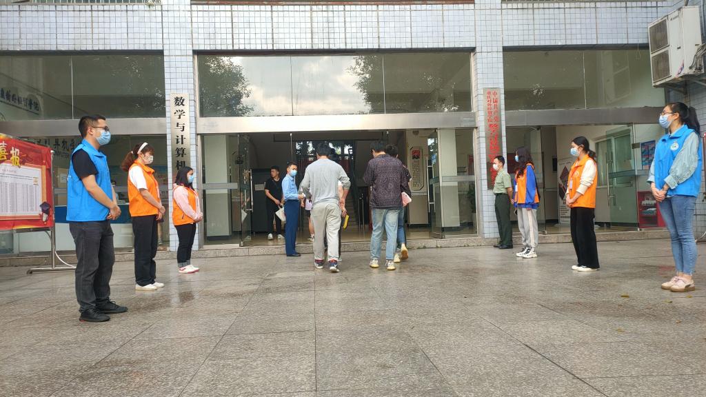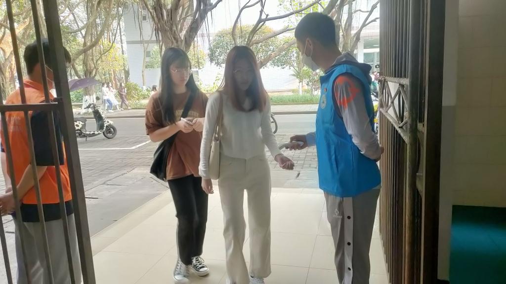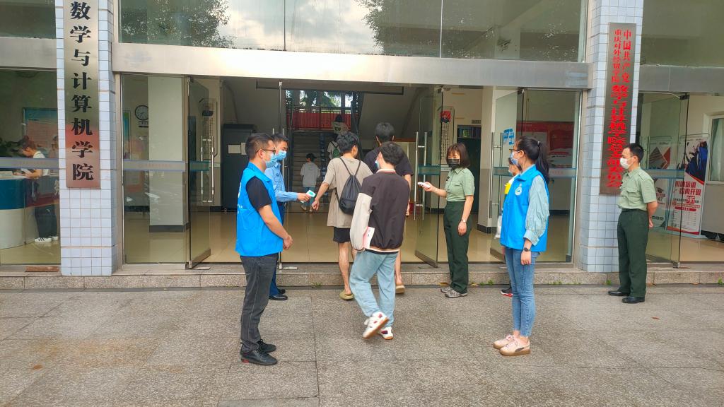在数学与计算机学院党总支的组织安排下,此次主动请战的学生党员成立了“求是”党总支疫情防控党员服务队。3月17日上午,学生党员身着志愿服装,佩戴党徽,在第三教学楼出入口进行严格站岗值守,为进入教学楼的同学测量体温,提醒同学们佩戴口罩、做好防疫保障。
