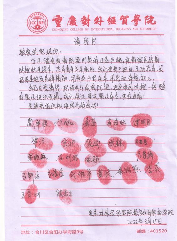 疫情就是命令,防控就是责任。学校党委发出疫情防控倡议书后,数学与计算机学院学生党员积极响应,学生党员主动请缨,共同写下“请战书”,申请参与到疫情防控一线。