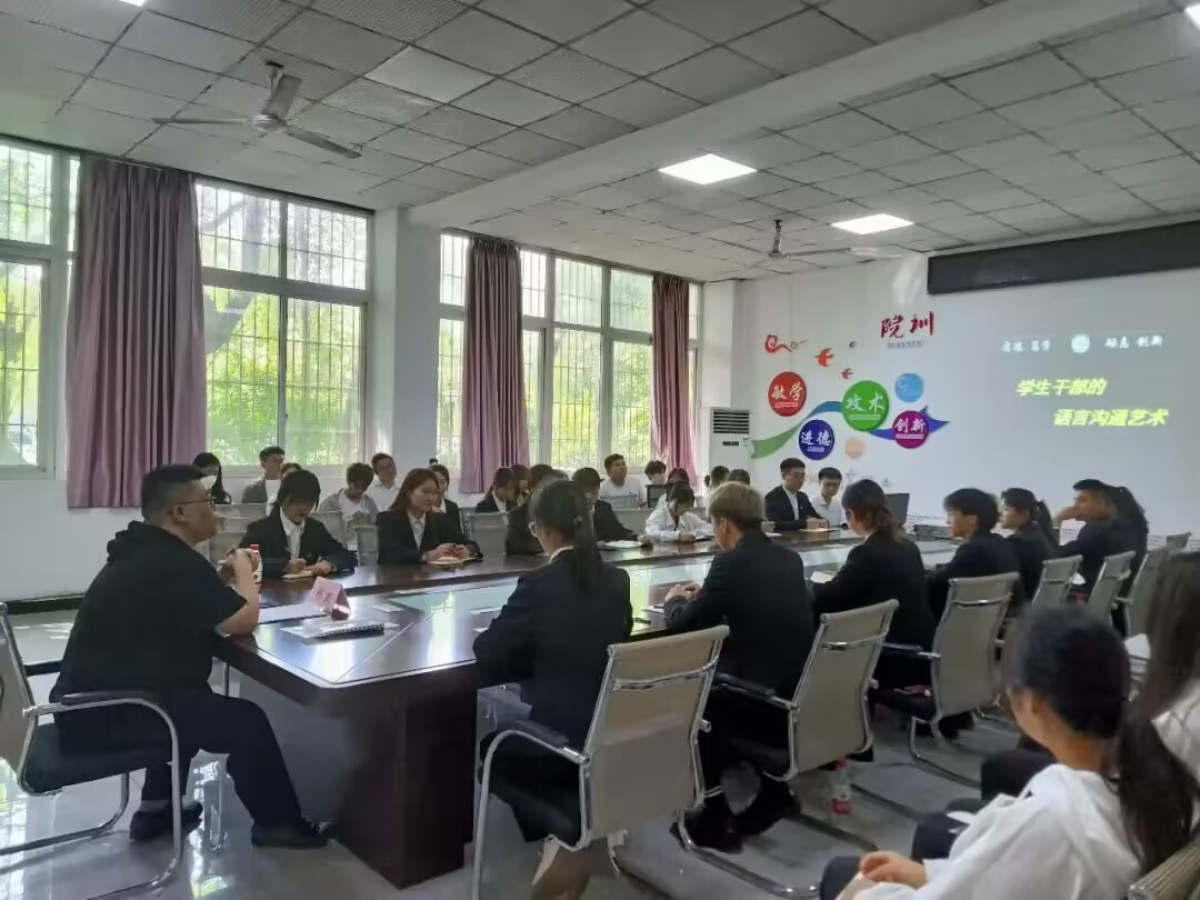 为进一步加强学生组织建设,提高数学与计算机学院学生干部的语言表达、交流、沟通能力,更好地推动工作的发展。2023年5月11日下午,数学与计算机学院辅导员杨凯老师在3103A会议室讲授《学生干部的语言沟通艺术》培训课。我院第十九届学生组织全体成员参加此次培训。