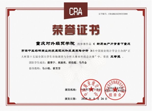 此次获奖,是对学生努力的肯定,也体现了学院“强实践、重应用”育人模式的教学实践成效。未来,重庆对外经贸学院学子将继续秉持竞赛精神,提升专业实践能力。